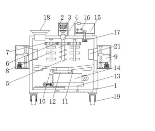 土壤修复釜,包括箱体,箱体的顶部固定连接有电机箱,且电机箱的顶部固定连接有第一电机,第一电机的输出轴通过联轴器固定连接有旋转轴,旋转轴的底端依次贯穿电机箱的底部和箱体的顶部且延伸至箱体的内部,旋转轴位于箱体内部的一端固定连接有螺旋杆,旋转轴位于箱体内部的表面固定连接有主动齿轮,本发明涉及